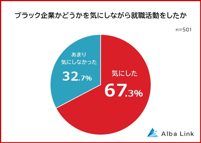 就職活動・転職活動をしたことがある501人に「ブラック企業かどうかを気にして就職・転職活動をしたか」と聞いたところ、「気にした」と回答した人が67.3%で多数。