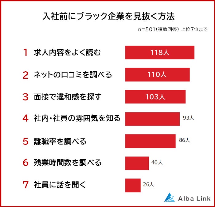 株式会社AlbaLink(本社:東京都江東区、代表取締役:河田 憲二)は、就職活動・転職活動をしたことがある501人を対象に「入社前にブラック企業を見抜く方法に関する意識調査」を実施し、そのデータをランキングにしました。