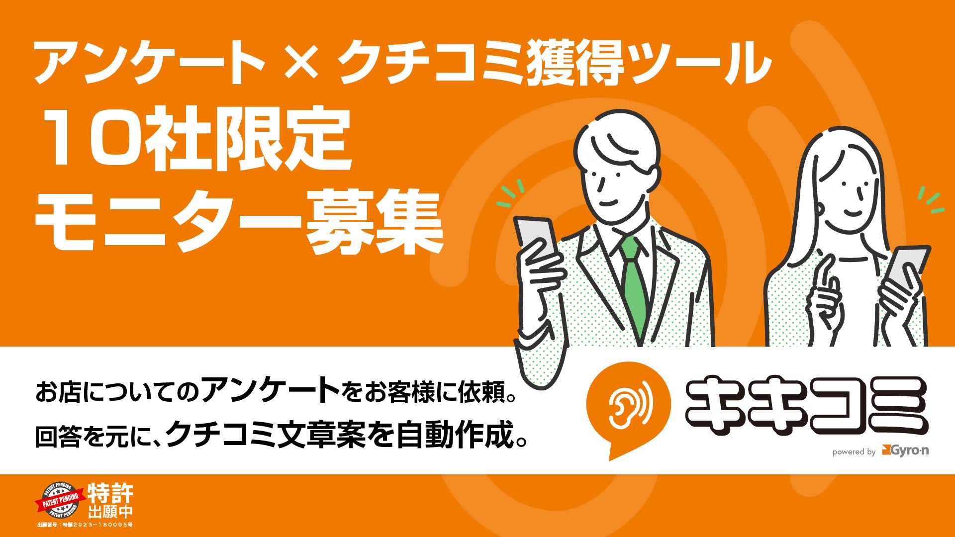 株式会社ユニヴァ・ジャイロン(東京都港区/代表取締役社長CEO・島津久厚)は、アンケート収集およびその回答からクチコミに投稿する文章案を自動生成する新ツール「キキコミ」の正式リリースに先立ち、実際に店舗に導入いただいて使用感のフィードバックや効果検証などにご協力いただける10社限定の無料モニターを、本日11月13日より募集開始することをお知らせします。