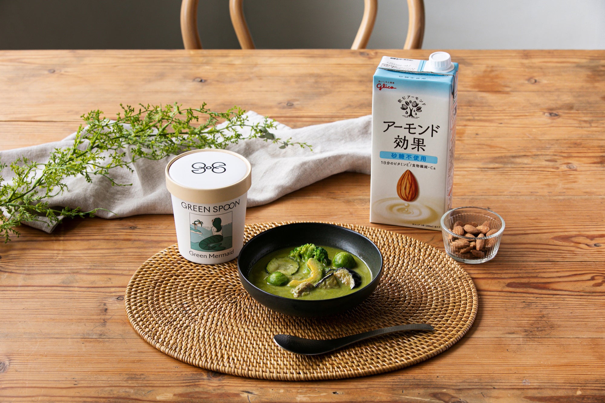 “自分を好きでいつづけられる人生を。”をビジョンに掲げ、あなたに必要な野菜が無添加*¹のスープ、ホットサラダ、スムージーになって自宅に届く、ベジタブル・ワンステップミール「GREEN SPOON」は、江崎グリコ株式会社のビタミンE(1日分*²)とたっぷりの食物繊維・カルシウムが摂れる「アーモンド効果」とタッグを組み、在宅ランチの新しい選択肢をご提案します。