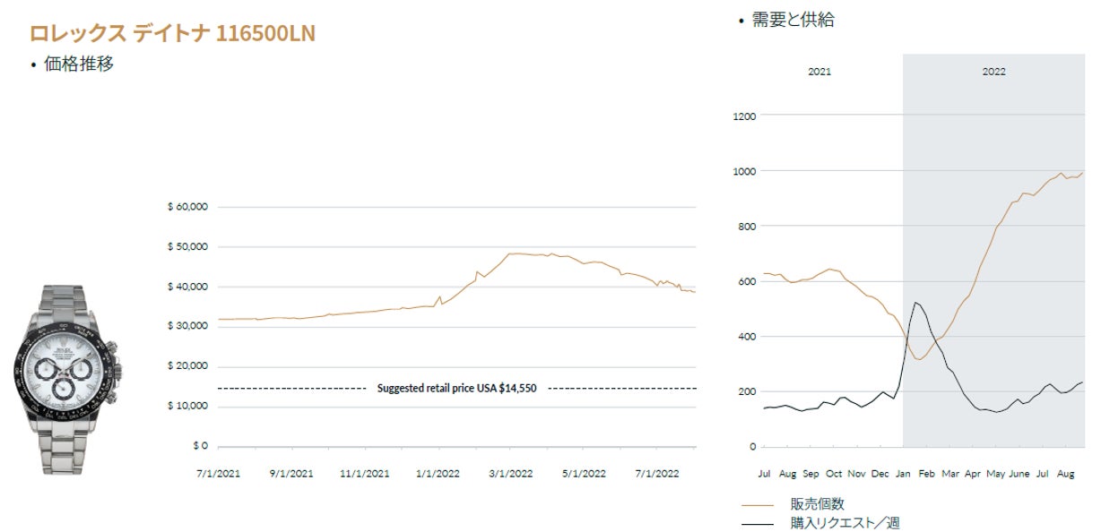 ※グラフに表示されている価格推移はChrono24によって作成された価格指数に基づいています。この指数の基礎は多くの時計モデルの価格推移に関するマーケットプレイスデータです。市場をできる限り正確に反映するために、モデルは販売高の割合に応じて重み付けされています。