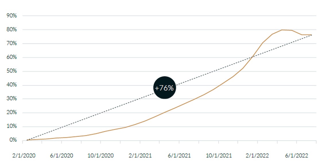 2020年初頭から2022年上半期末までの間に、Chrono24で販売されている時計の価格は平均して76%上昇