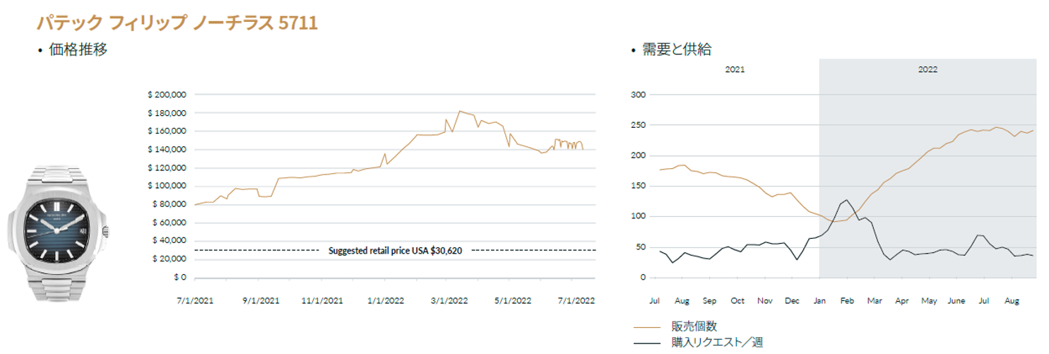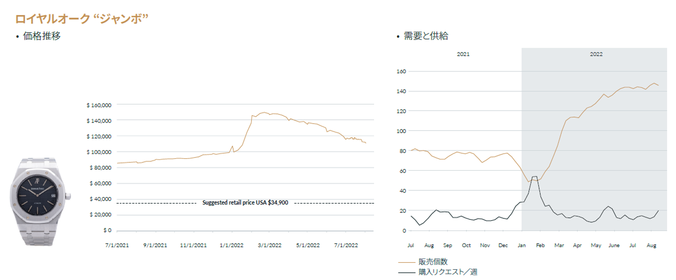ノーチラス、ロイヤルオーク、デイトナのモデルの出店数が2022年上半期に大きく増加しました。これに対し、需要は年初に若干減少しています。需要がわずかに減少する中、供給量が膨れ上がったことにより、価格の下落が起こり、こうした「トロフィーウォッチ」モデルの価値が下落した、という見解も見られますが、広い視野で見れば、高級時計の価値は上がり続けています。実際、2022年の動向を包括的に見ると、Chrono24上の時計は今年の4月と5月には、 2022年1月よりも平均約12%高く、6月末の価格水準は2022年1月よりも約10%高くなっています。