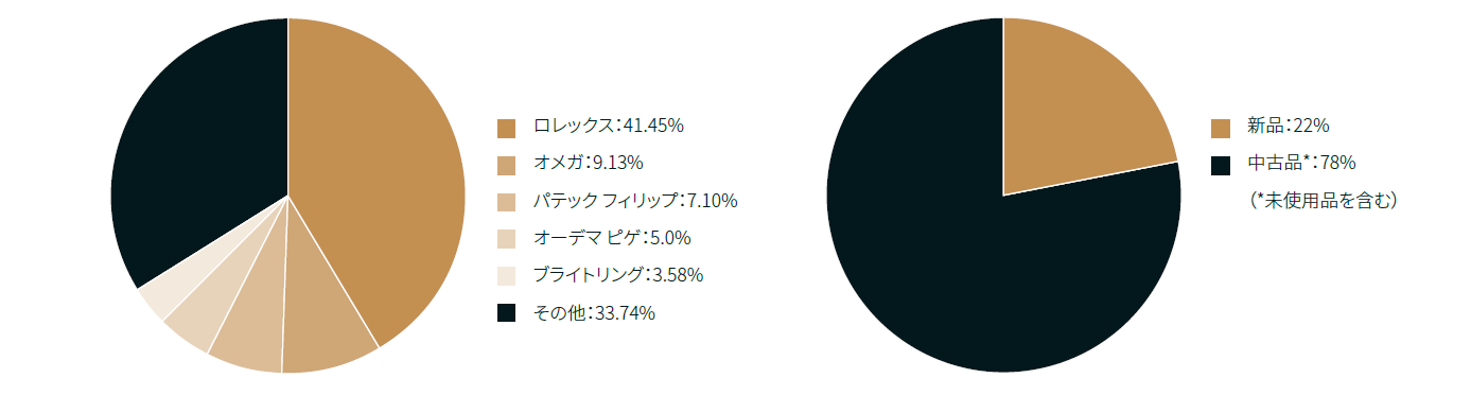 ロレックスが全販売高の41.45%を占め、続いて、オメガが9.13%、パテックフィリップが7.1%、オーデマピゲが5%、ブライトリングが3.58%の結果となりました。また、販売高の22%が新品、中古品が78%を占めました。