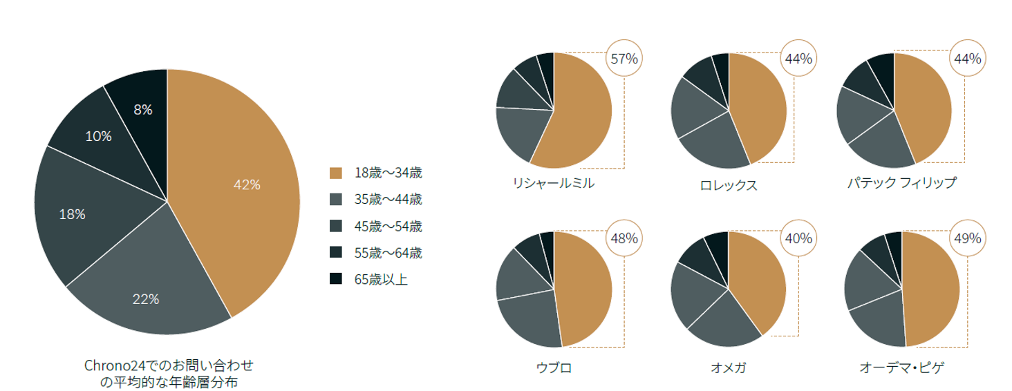 Chrono24における購入リクエスト数全体の42%は、18歳から34歳(ミレニアル世代とZ世代が混在)のユーザーによるものが占めています。ブランド別に見ると、特にこの年齢層は、リシャールミルの57%、ウブロの48%、オーデマ ピゲの49%を占めているということが判明しました。