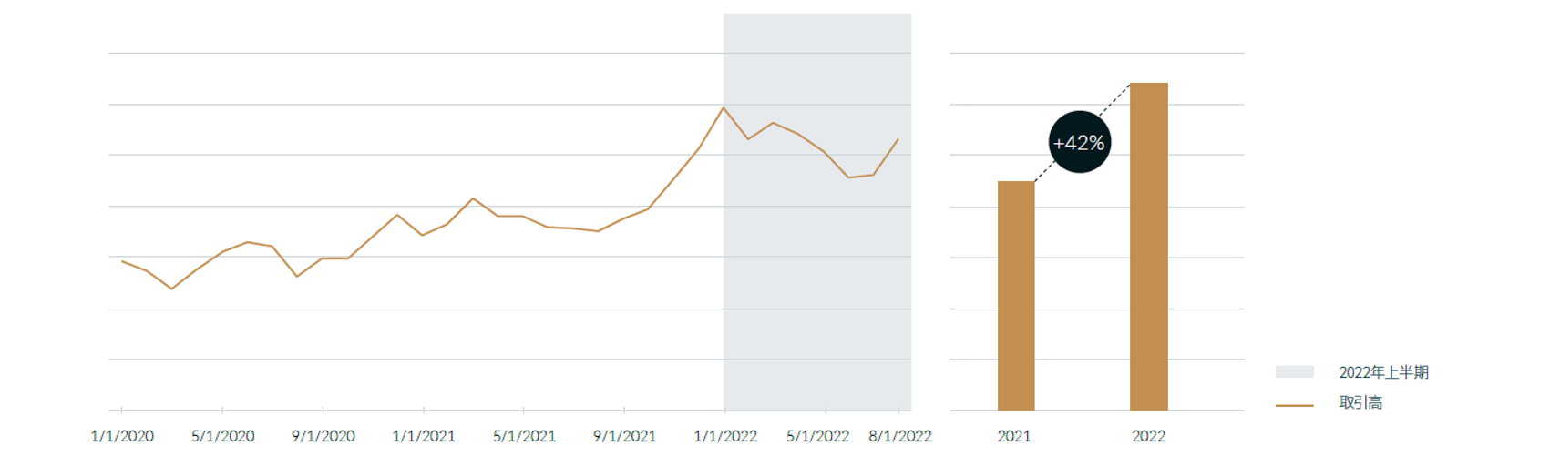 また興味深いことに、2022年上半期の弊社における販売高は、市場価格の変動にもかかわらず減少するどころか大きく上昇しています。販売数は前年の水準と比較して14%、販売高は43%の増加となりました。