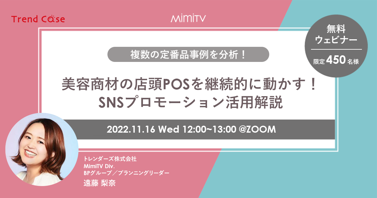 トレンダーズ株式会社(所在地:東京都渋谷区、代表取締役社長:黒川涼子、東証グロース上場:証券コード6069)が運営する美容メディア「MimiTV」は、無料ウェビナー「美容商材の店頭POSを継続的に動かす!SNSプロモーション活用解説」を、2022年11月16日(水)に開催いたします。