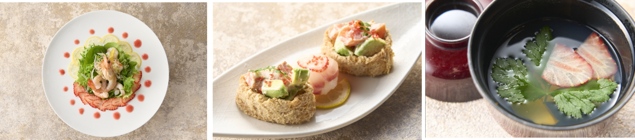 「いちごグルメフェア」開催期間中は、地元の朝採れ完熟いちごを使ったお料理とデザートが楽しめる期間限定メニューとして「いちご尽くし御膳」(1日10食限定)を提供します。「いちご尽くし御膳」では、いちごドレッシングで楽しむ海老3種のサラダや、いちご酢で仕立てたアボカドとサーモンのお稲荷さん、デザートの「小さないちごのミルフィーユ」まで、いちごをふんだんに使ったいちご尽くしメニューが楽しめます。また、お吸い物には、東北の郷土料理「いちご煮」(ウニとアワビの吸物)に実際に本物のいちごを浮かべた、ここでしか味わえない「アワビとウニの“いちご煮”」をご用意しています。