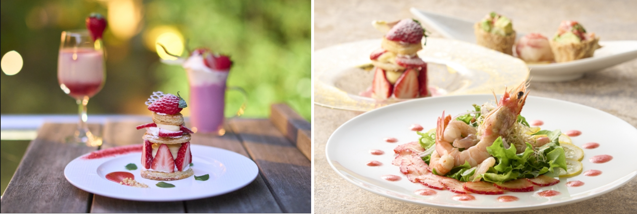 左から「森のいちごミルフィーユ」「いちご尽くし御膳」