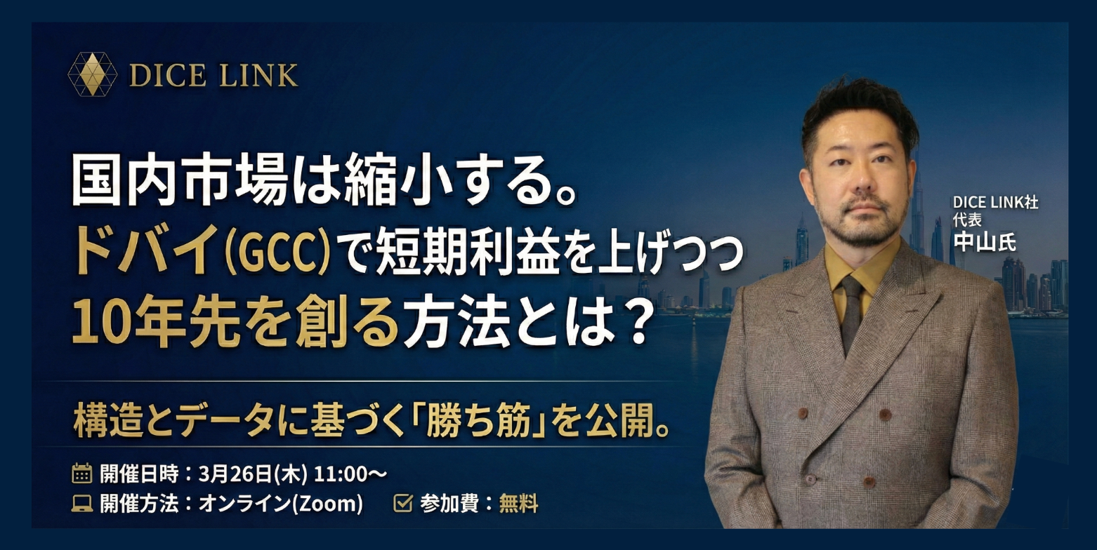 そこで今回、GCC(ドバイ)市場での日本企業支援に特化したダイスリンク株式会社代表・中山大輔氏を迎え、ワンミニッツ株式会社との共催ウェビナーを開催いたします。データと実践に基づく戦略論をもとに、「なぜGCC(ドバイ)なのか」「どう進めれば結果が出るのか」を具体的にお伝えします。