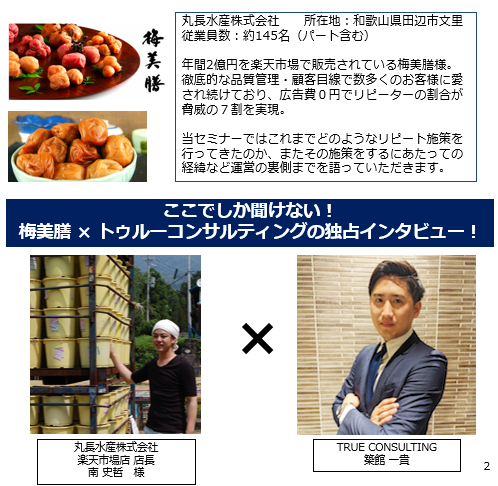 今回、通販年商2億円、楽天の梅干し市場でトップ通販食品企業である「梅美膳」様の楽天市場店長、南史哲様に特別にご講演頂くことになりました。