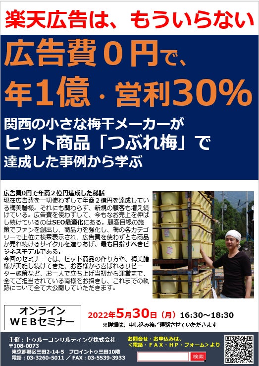 関西の小さな梅干メーカーがヒット商品「つぶれ梅」で広告0円で年2億円達成した楽天市場店長の南史哲様をお呼びして、『関西の小さな梅干メーカーがヒット商品「つぶれ梅」で広告0円で年2億円達成セミナー!!』を2022年5月30日(月)に開催いたします。