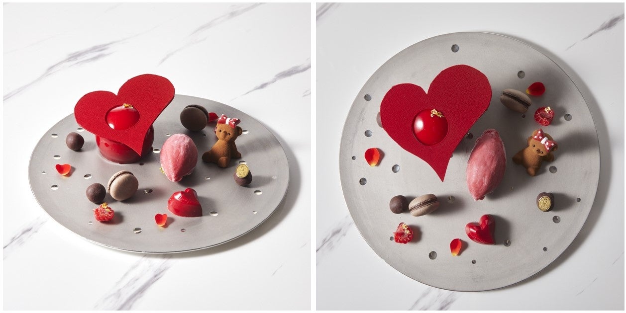スフェール ショコラ(球体のムースショコラ)の中にはラズベリーのジャム、アールグレイブリュレ、サクサクのフレークなどを閉じ込めました。大きな真っ赤なハートとヌーミーのガールフレンドのエイミーのバレンタイン限定デザートです。