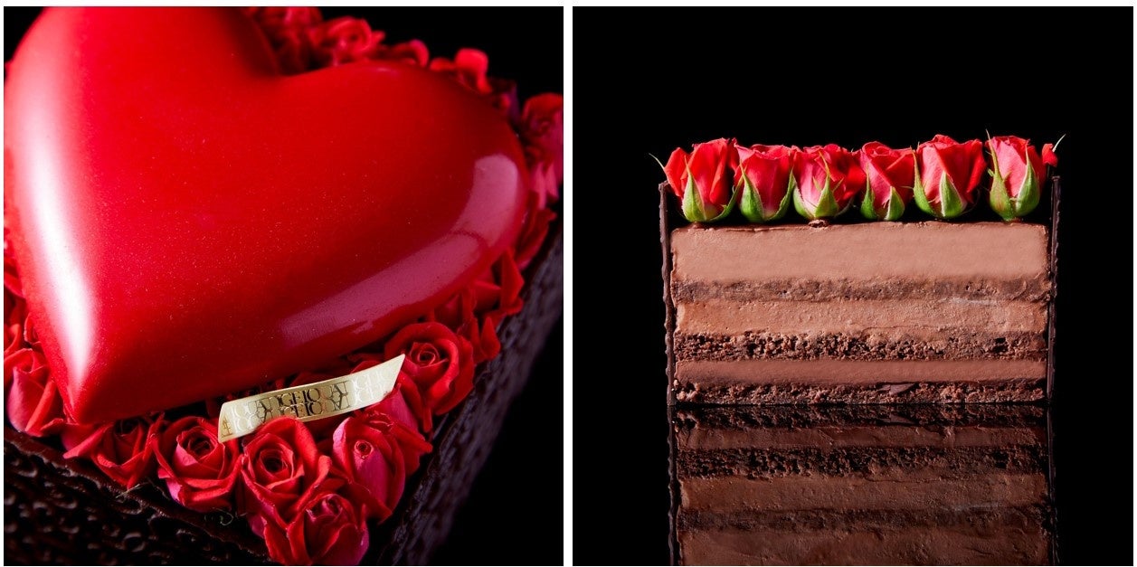 伝統あるヴァローナ社のチョコレートを独自にブレンドし、焙煎したカカオ豆本来の風味を最大限に残しつつ、口どけのよいグルテンフリーのチョコレートケーキに仕上げました。大きなハートのチョコレートを乗せて、真っ赤なベルローズで埋めたバレンタインの期間限定商品です。