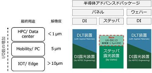 今回、ステッパのラインアップに、半導体アドバンスドパッケージにおいて重要な役割を果たすインターポーザー基板対応の新製品「UX-59113」が加わることで、より幅広いお客様のニーズを取り込み、生成AI半導体を中心とした次世代パッケージ基板の技術革新に貢献する充実した製品ラインアップが構築されます。
