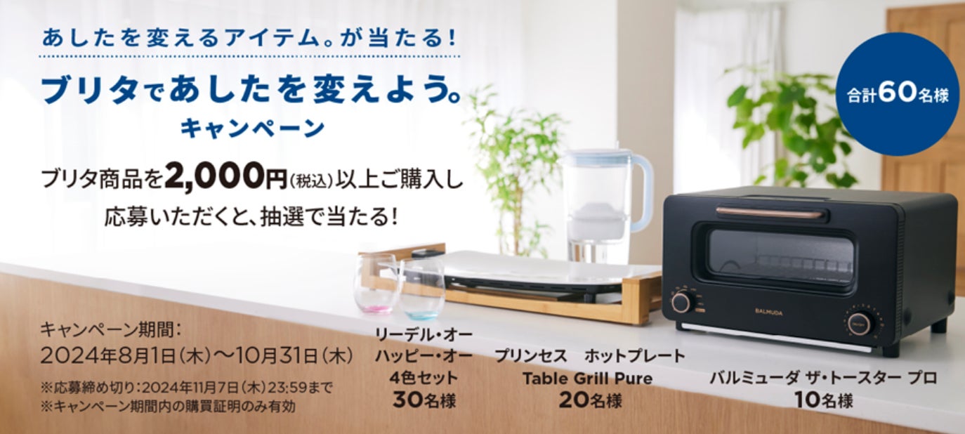 このたび、本プロジェクトの一環として、ブリタ商品を税込2,000円以上お買い上げいただきご応募いただくと、暮らしがちょっと素敵に変わる“あしたを変える” アイテムが合計60名様に当たる『ブリタであしたを変えよう。キャンペーン』第2弾を、 2024年8月1日(木)~10月31日(木)として実施いたします。