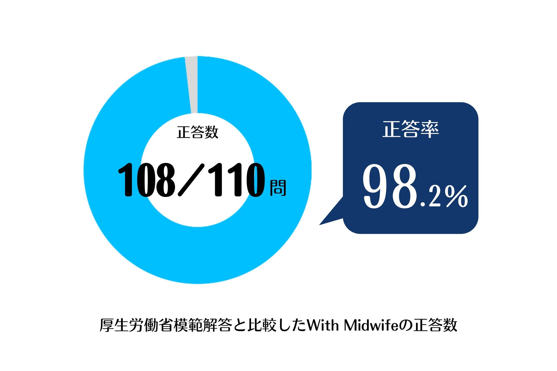 With Midwifeが公開した解答は、厚生労働省が公開した模範解答との比較の結果、午前問題55問中53問(誤答2問)、午後問題55問中55問(誤答なし)の正答数となりました。