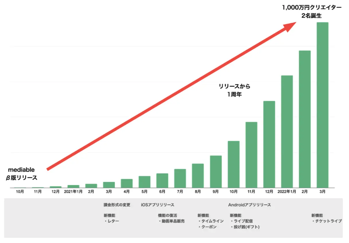 10月にはリアルタイムでファンと繋がれるライブ配信機能と投げ銭機能、Androidアプリのリリースし、YouTubeのチャンネル登録者数が100万を超えるクリエイターがmediableを開始しました。