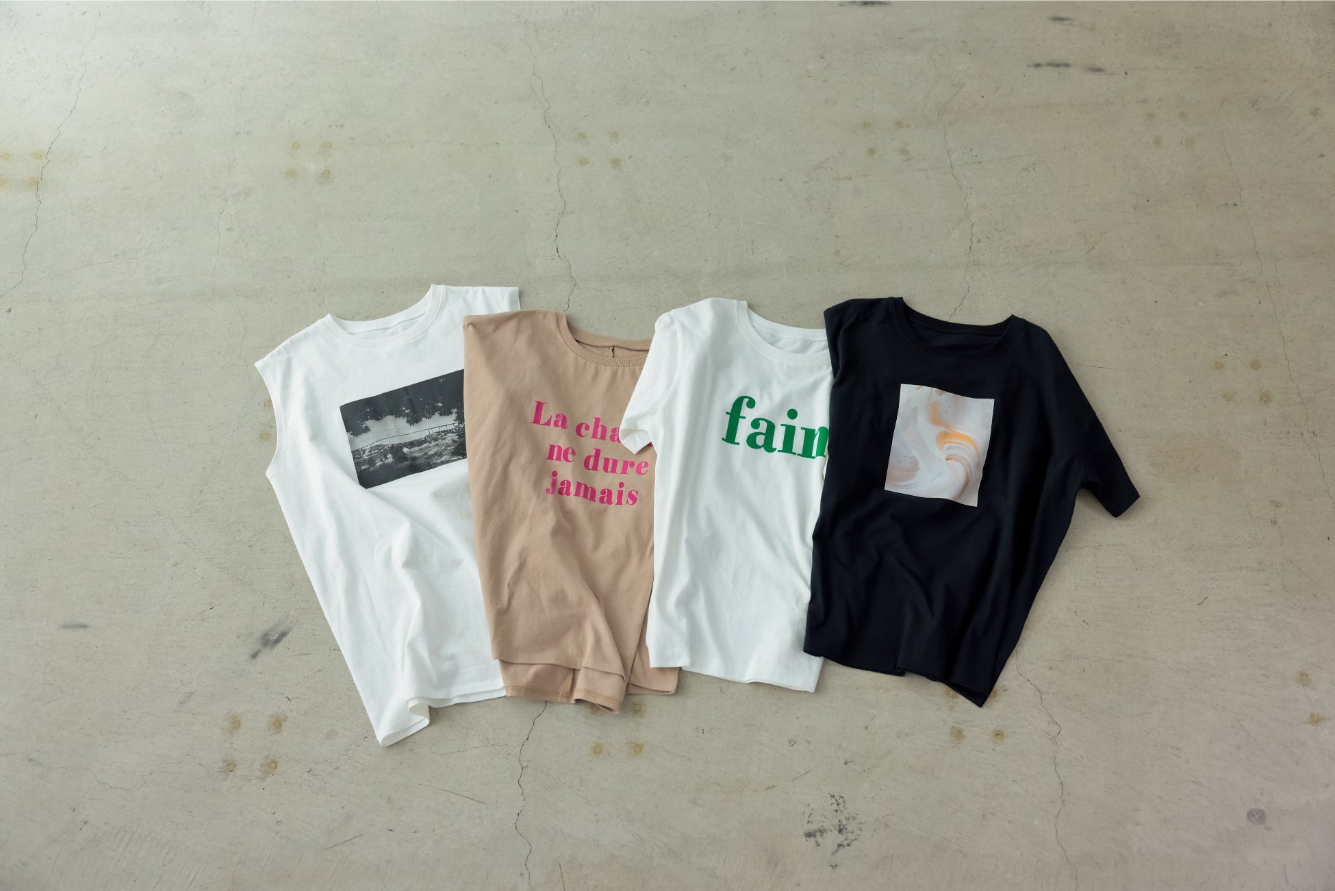 シンプルなロゴTから、モードな印象をプラスするプリントTまで、多様なデザインをご用意いたしました。カラーはブラック、ホワイト、ベージュのベーシックカラーを基調とし、普段のスタイリングに取り入れやすい大人なデザインに仕上げました。