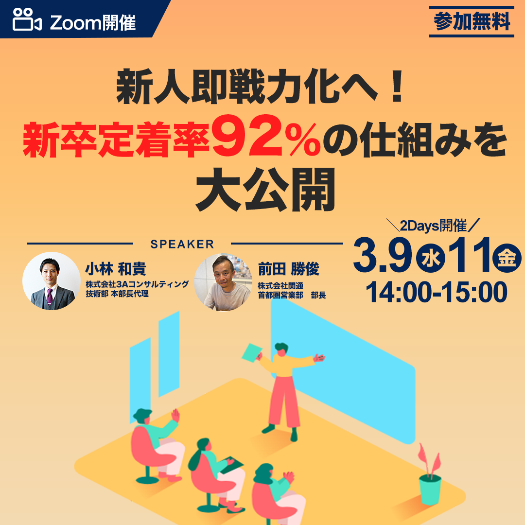 【無料ウェビナー】経営者様・人事の方必見!新人即戦力化へ『新卒定着率92%』の仕組みを大公開!3/9(水)・3/11(金) 2days開催
