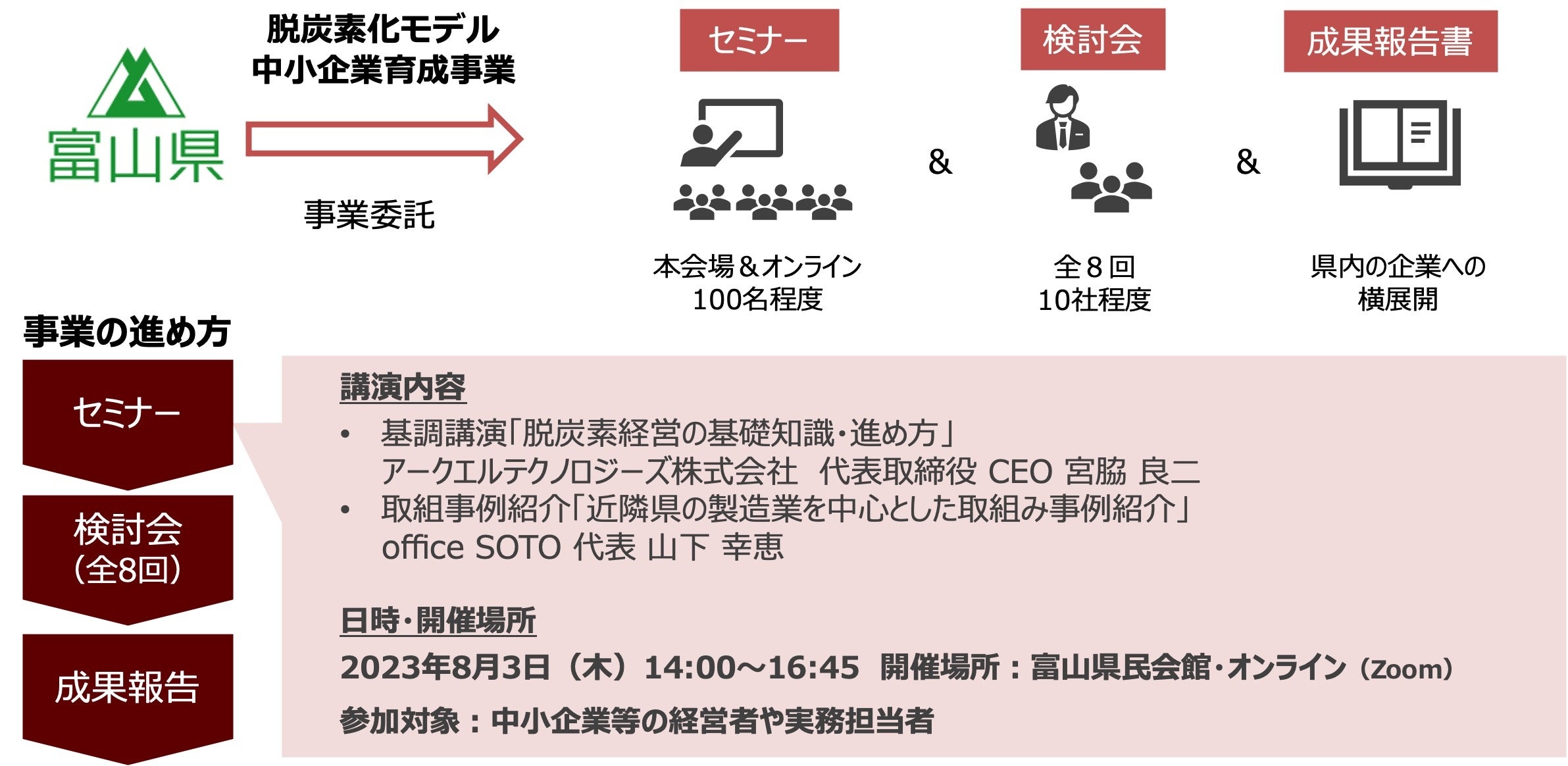アークエルテクノロジーズ株式会社(本社:福岡県福岡市、代表取締役社長:宮脇良二、以下「AAKEL」)は、富山県より脱炭素化モデル中小企業育成事業実施業務を受託しました。8月3日(木)14:00~16:45に富山県会場(会場:富山県民会館)及びオンラインの両会場においてセミナーを開催します。セミナーでは脱炭素経営の進め方に関する基調講演、近隣県の製造業を中心とした取組み事例の紹介を行います。
