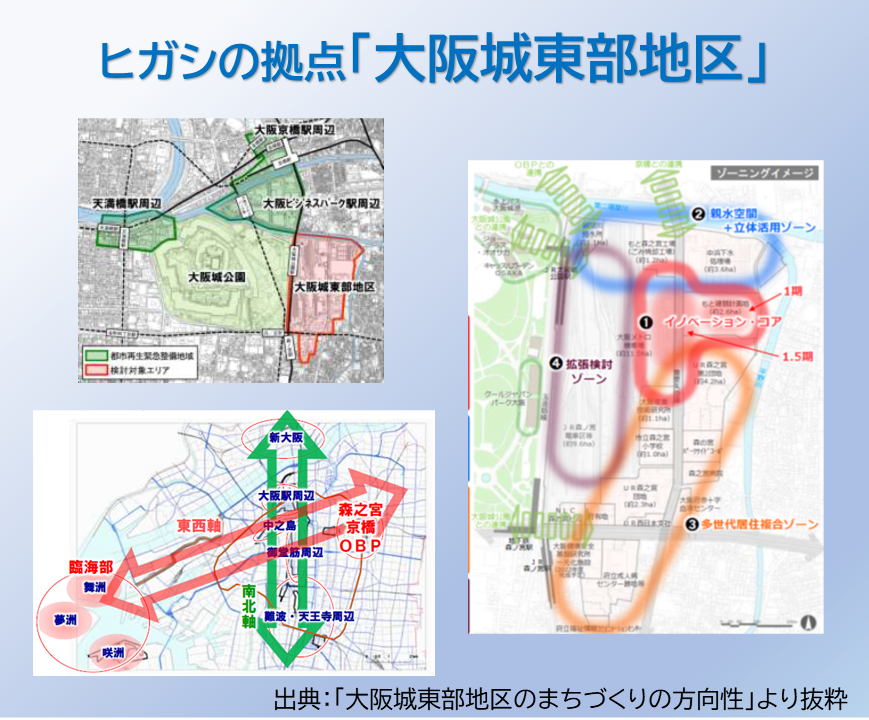 大阪府、大阪市では、新大阪~キタ~ミナミを結ぶ南北都市軸に加え、大阪・関西万博の会場であり、IR 立地への検討が進められている夢洲を含む臨海部から、文化、歴史等が集積する大阪城周辺や京阪奈学研都市へと続く東西都市軸の形成を進められており、その中でも大阪城東部地区は「ヒガシ」の拠点として重要性が高まっています。
