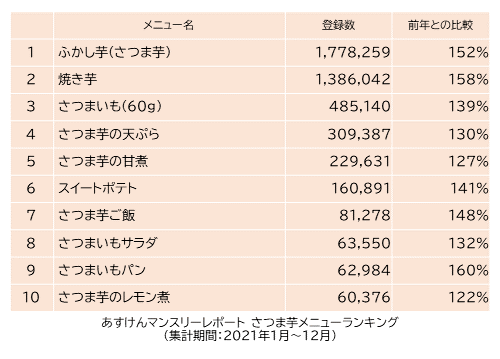 AI食事管理アプリ「あすけん」マンスリーレポート 【さつま芋】メニュー登録数年間ランキング ~シンプルな【ふかし芋】と【焼き芋】がトップ2!~