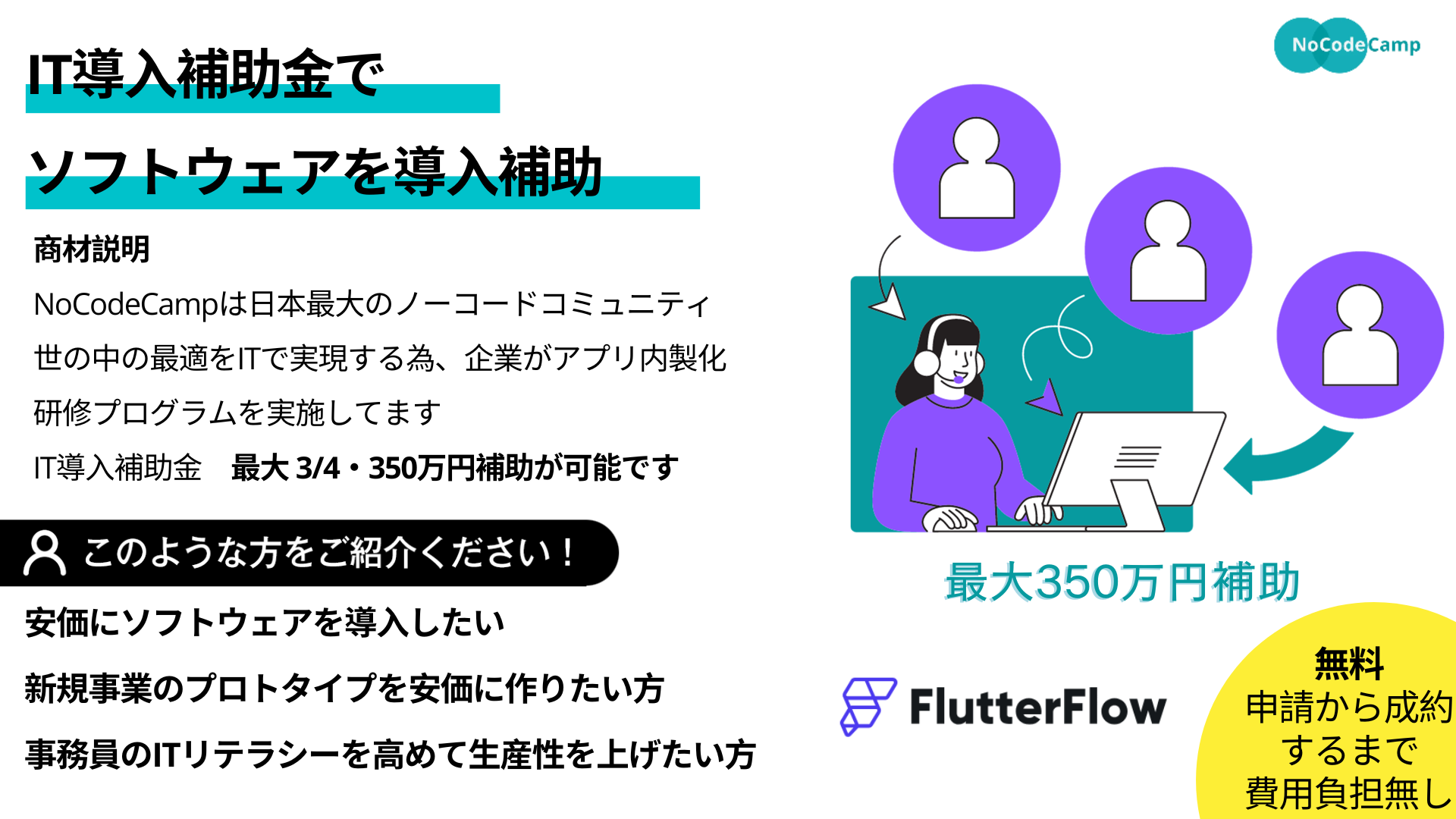 合同会社NoCodeCamp(本社:東京都稲城市、代表:宮崎 翼)が、日本で開発事例が増加しているノーコードツール「FlutterFlow」のIT導入補助金を申請する許可を得たことをご報告します。