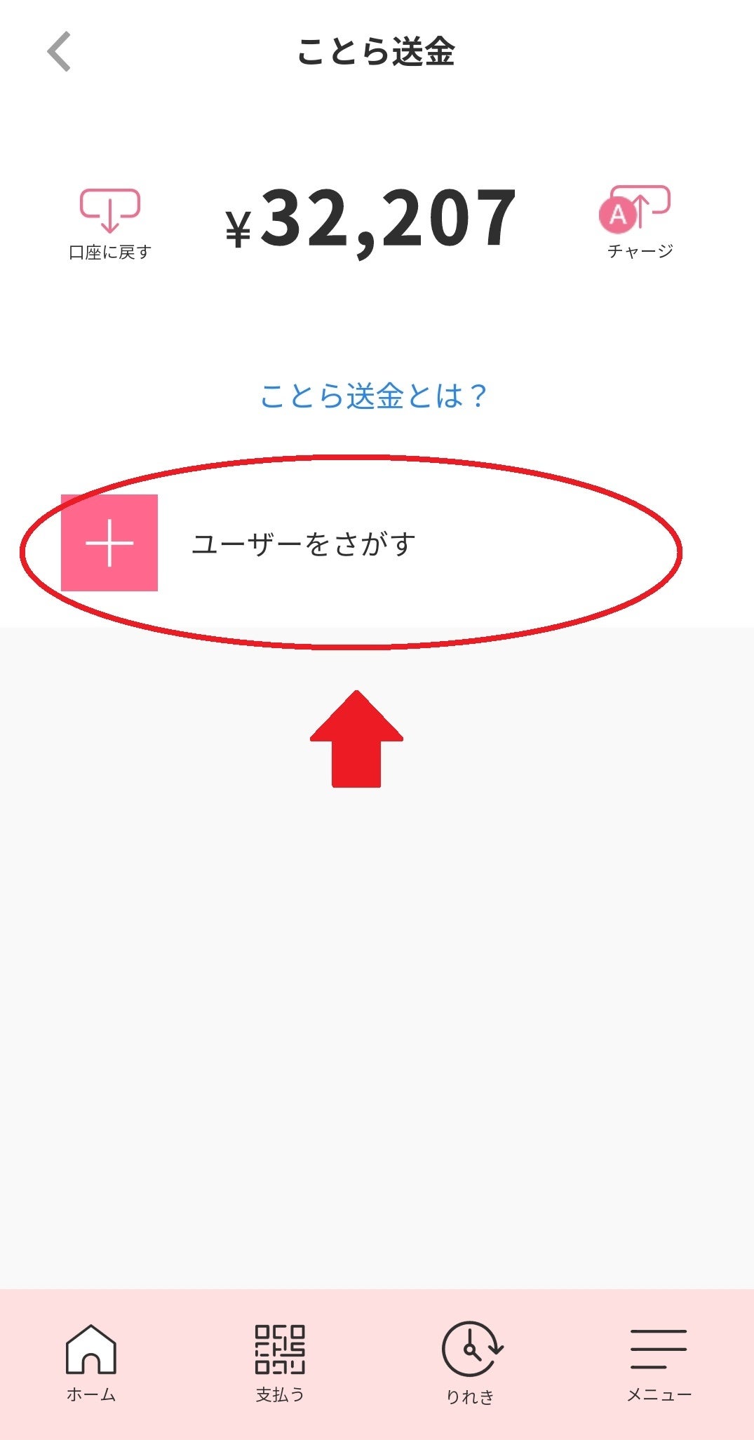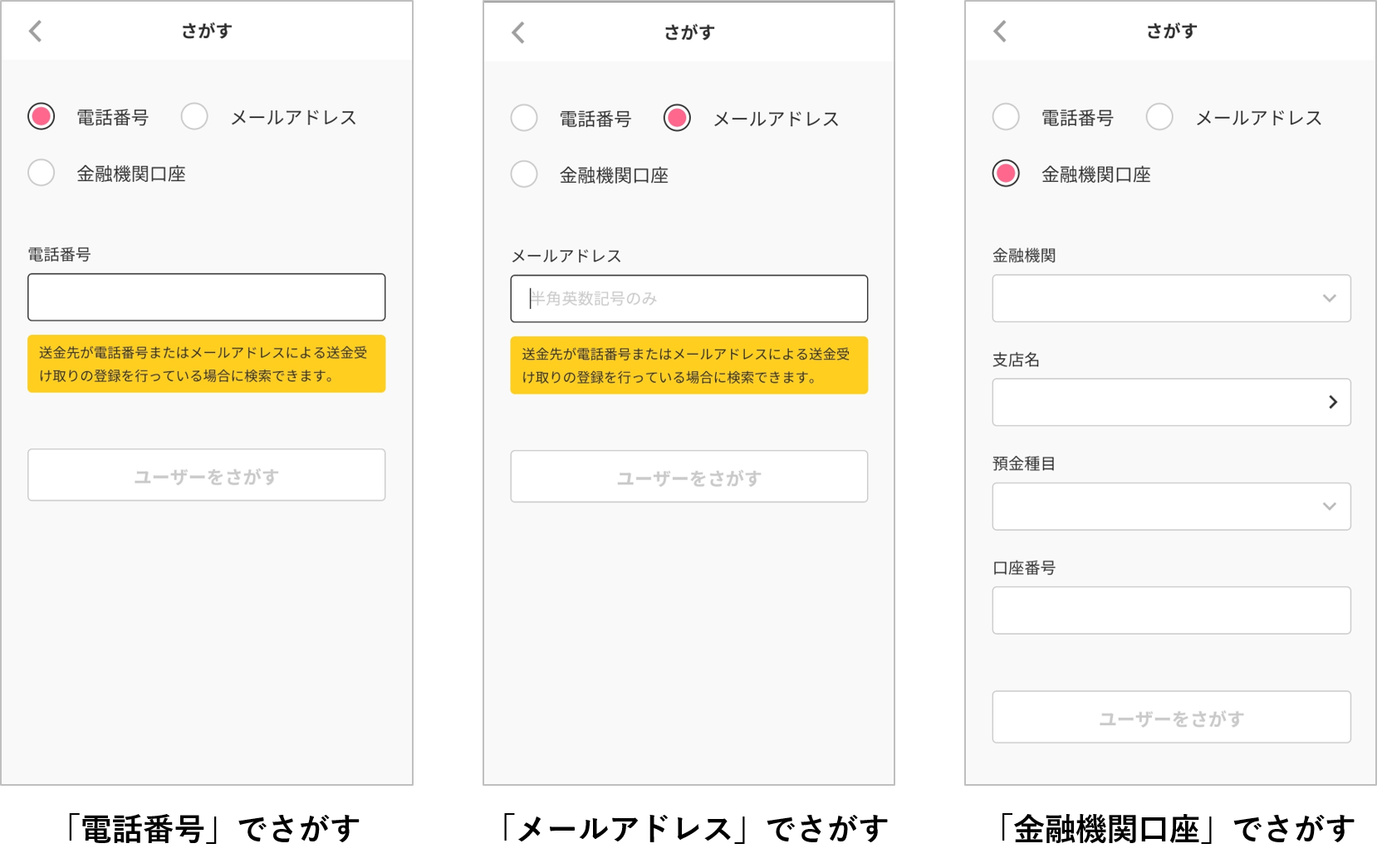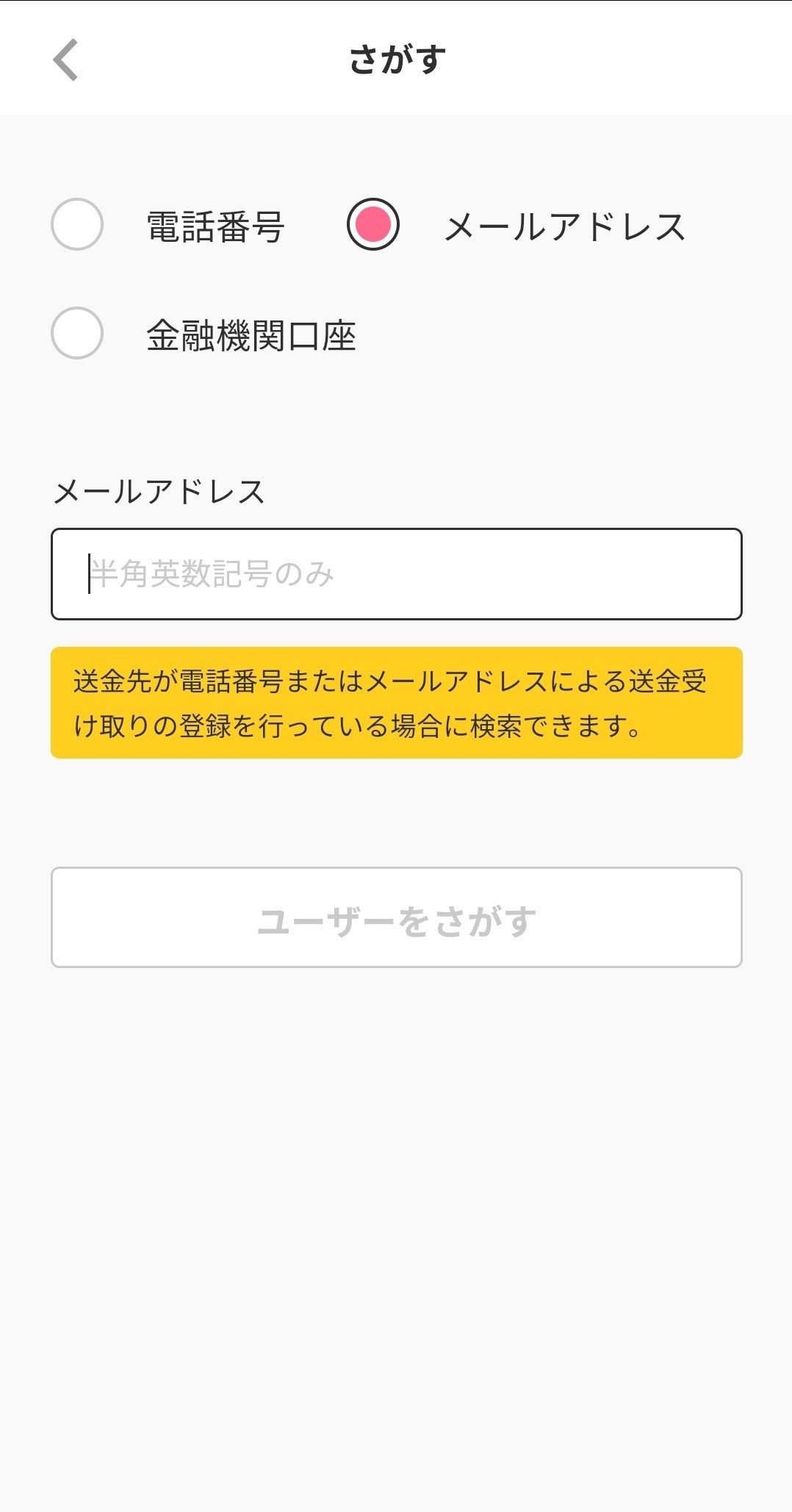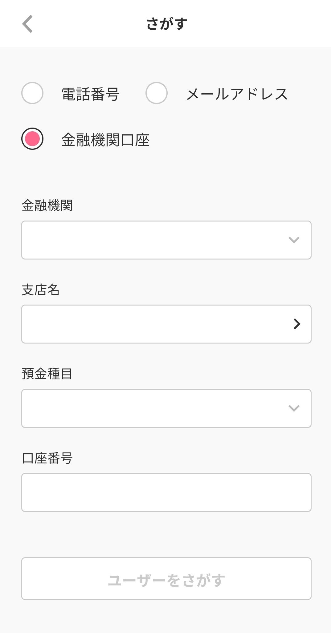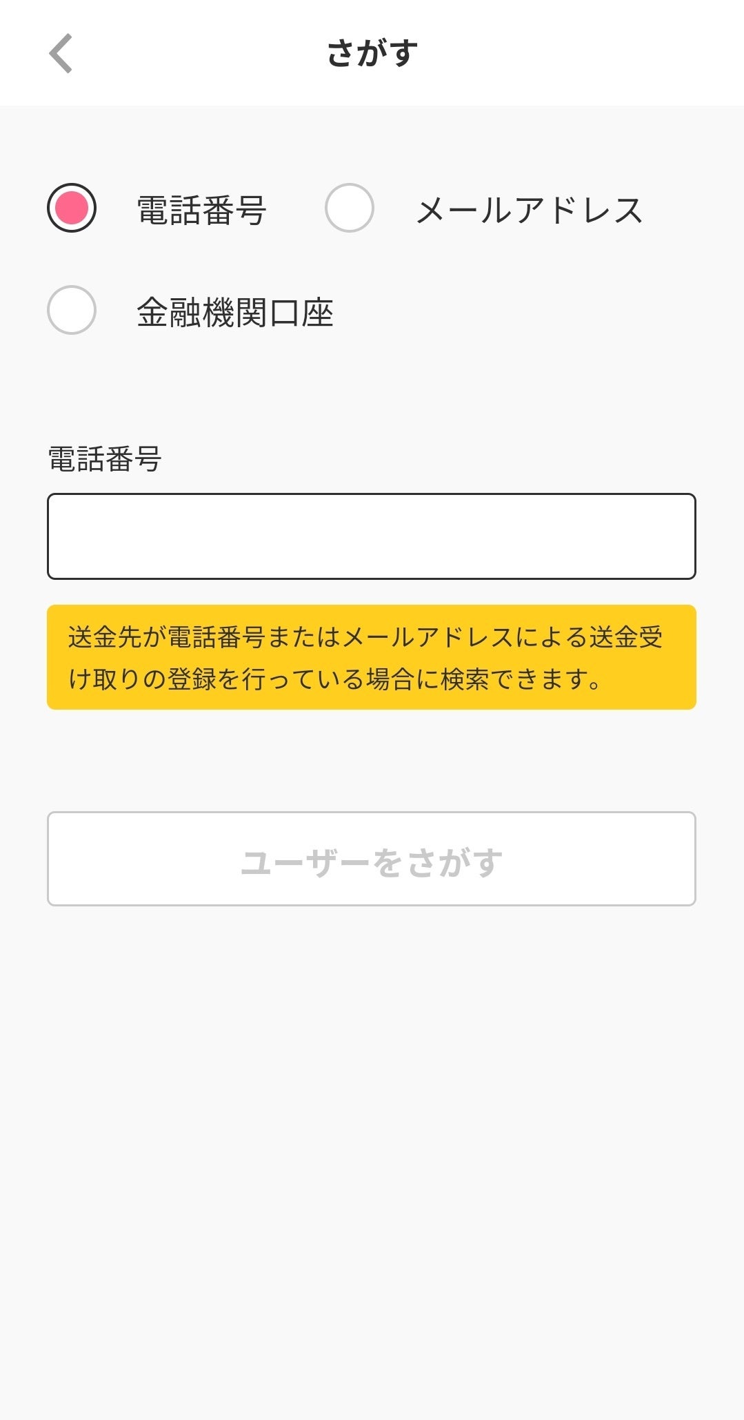 ③「電話番号」、「メールアドレス」、「金融機関口座」のいずれかの方法で、送金相手をさがします。