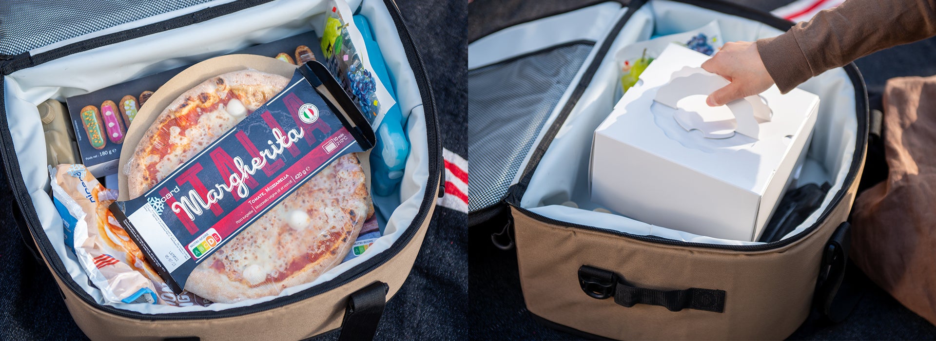 大きい開口部、ワイドな形状にしたことで今まで縦にして収納していた冷凍ピザも、ホールケーキだって箱のまま運ぶことが叶えられるようになりました。従来のように広い底を手に入れるために必要以上に大きなクーラーを使う必要はありません。