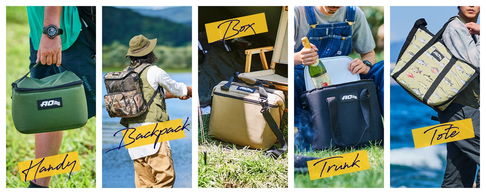 好みや用途に合わせ、最適なクーラーバッグを選びアウトドアを心おきなく楽しむことができるよう、AO Coolersは、驚異の保冷力はそのままに5種の形状のクーラーバッグを用意しています。