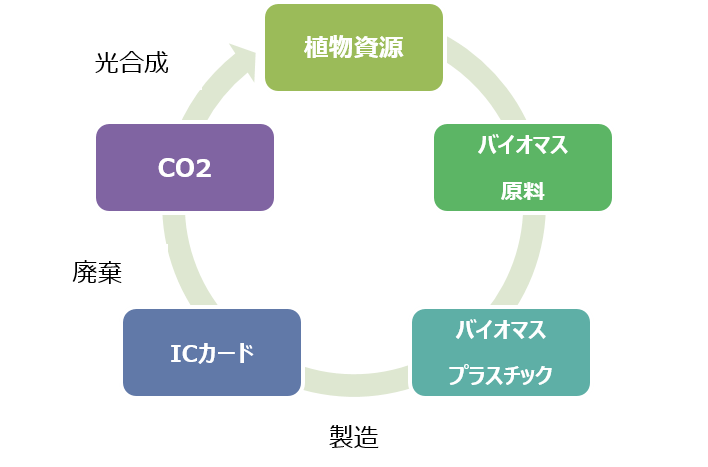 層構成の一部に植物資源由来のプラスチック(バイオマスプラスチック)を使用したICカードで、脱炭素社会を実現するべく、共同印刷グループの環境ビジョンに基づき、カード事業においても、地球温暖化の原因となる大気中のCO2濃度上昇を抑制することに貢献します。