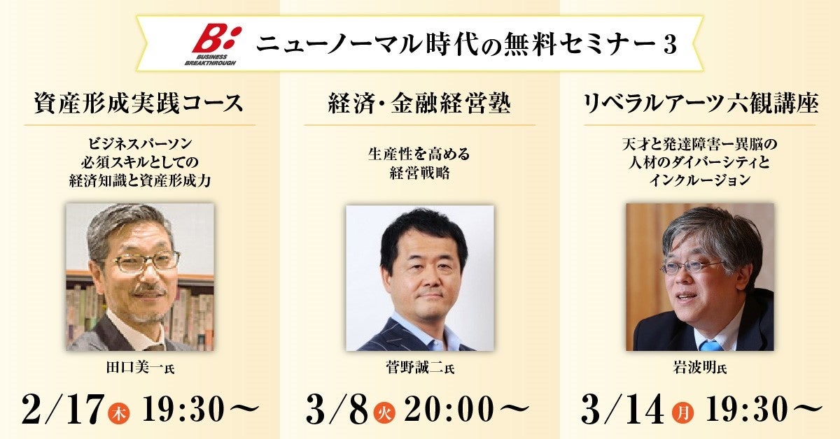 あらゆる年齢層に対し生涯に渡るリカレント教育(※)を提供する株式会社ビジネス・ブレークスルー(所在地:東京都千代田区、代表取締役:柴田巌、以下BBT)が運営する3つのプログラム(資産形成実践コース、経済金融経営塾、リベラルアーツ六観講座)は、『ニューノーマル時代のリカレントセミナー3』を2月17日(木)より順次開催します。