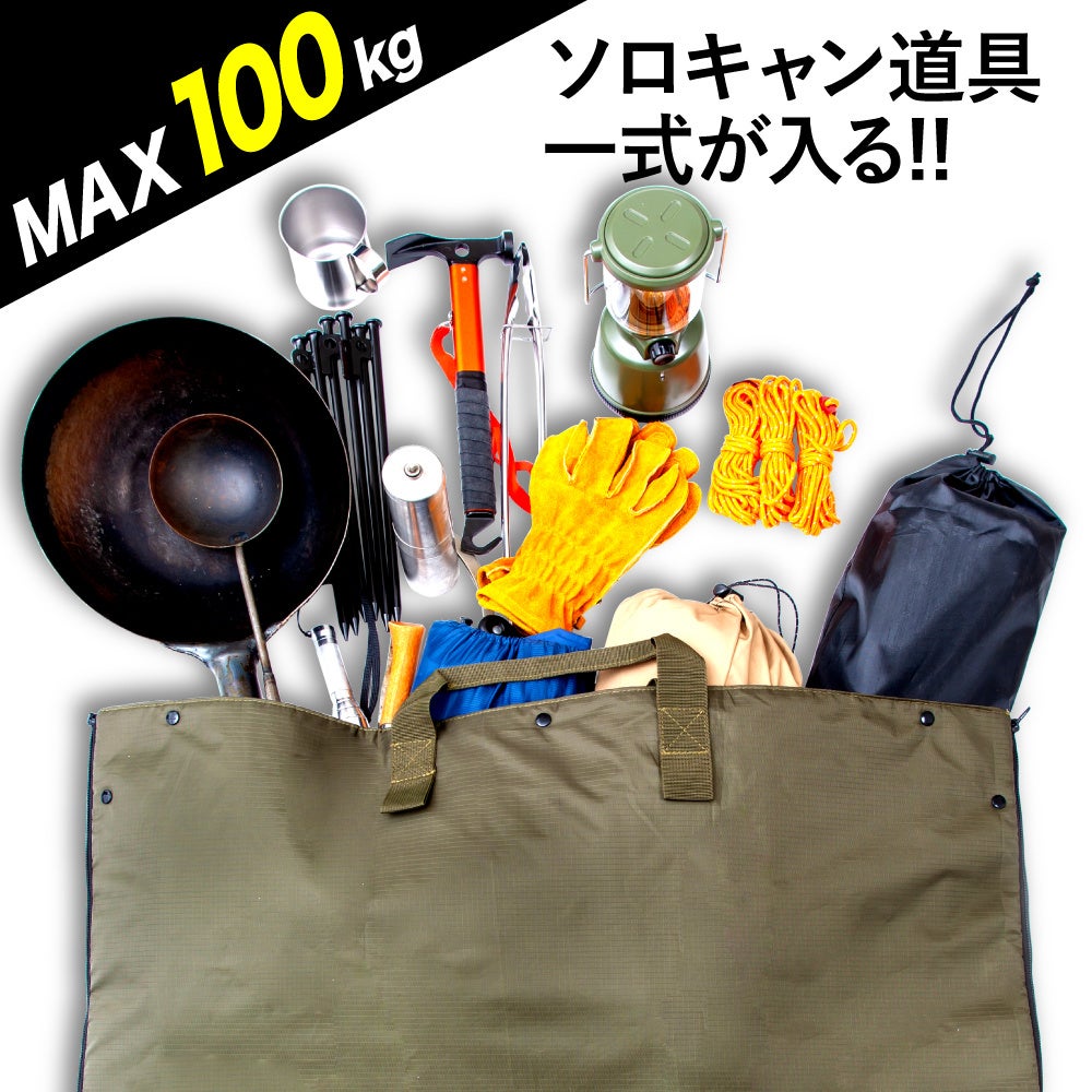 新発想の超ビッグバッグにはソロキャンプの用品が(一式全て)入り持ち運びが可能です。応援購入者様のコメントでは「キャンプの時に荷物を運ぶ車との往復回数が減るため嬉しい!」とのご意見も頂いております。
