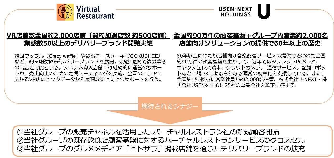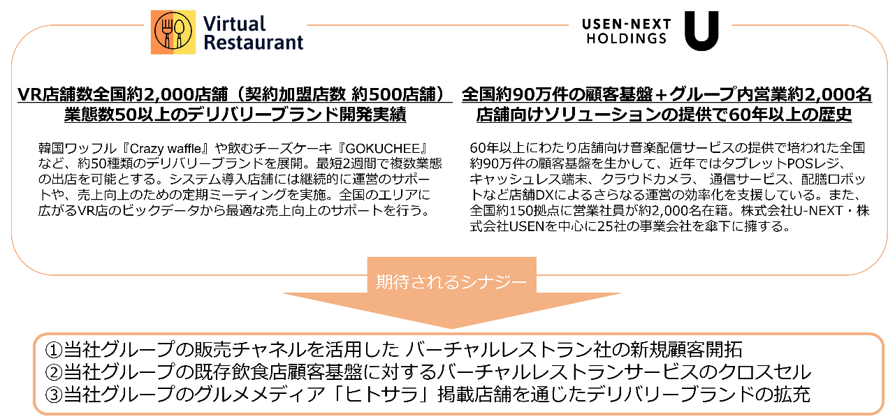 株式会社バーチャルレストランはUSEN-NEXT GROUPの販売チャネルや顧客基盤を活用し、バーチャルレストランの拠点・ブランドのさらなる拡大を目指す。