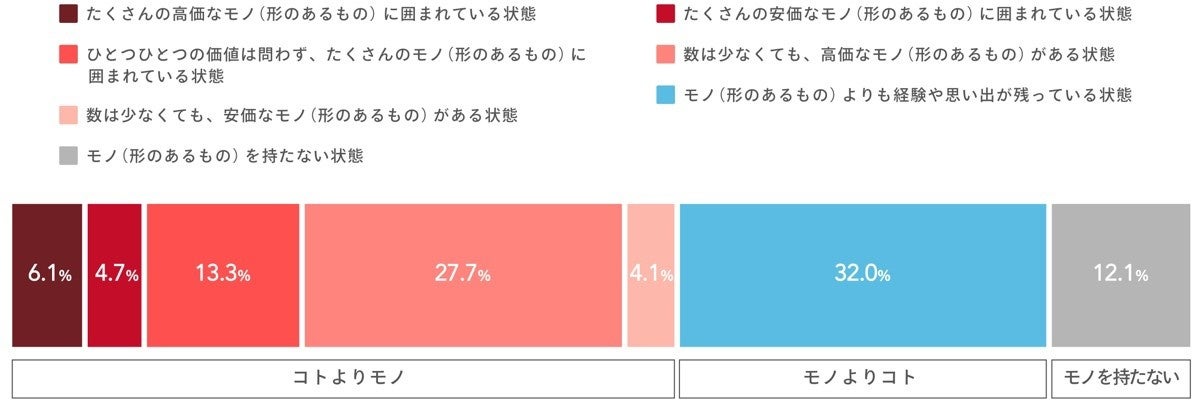 - 年代が上がるにつれ、「モノよりコト」「モノを持たない状態」を理想とする傾向に