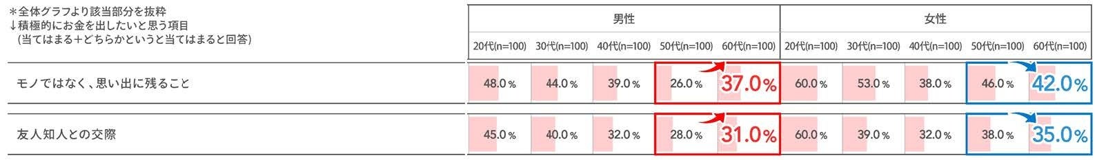 - 男性の「モノではなく、思い出に残ること」への出費意欲が50代から60代にかけて急上昇
