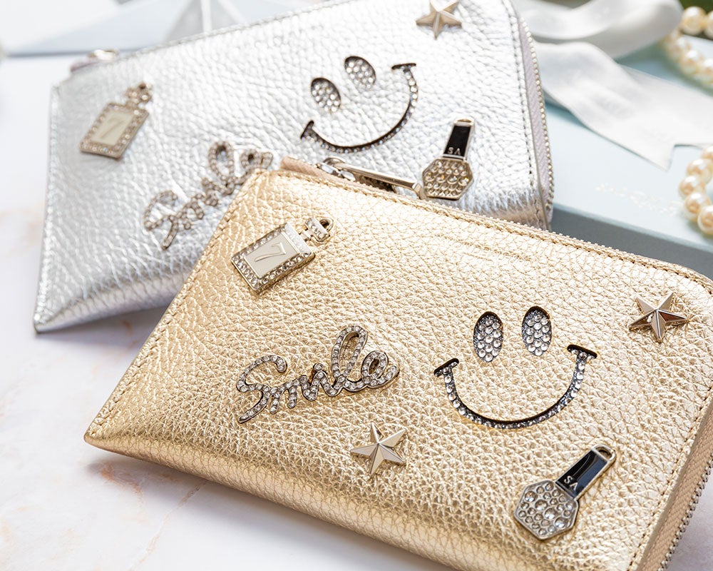 ▲ イタリアンレザーに、煌めくトッピングパーツをデザインした『ルクーチェ』シリーズ。サロンドアルファードを代表する人気シリーズは財布をはじめバッグや小物など展開。