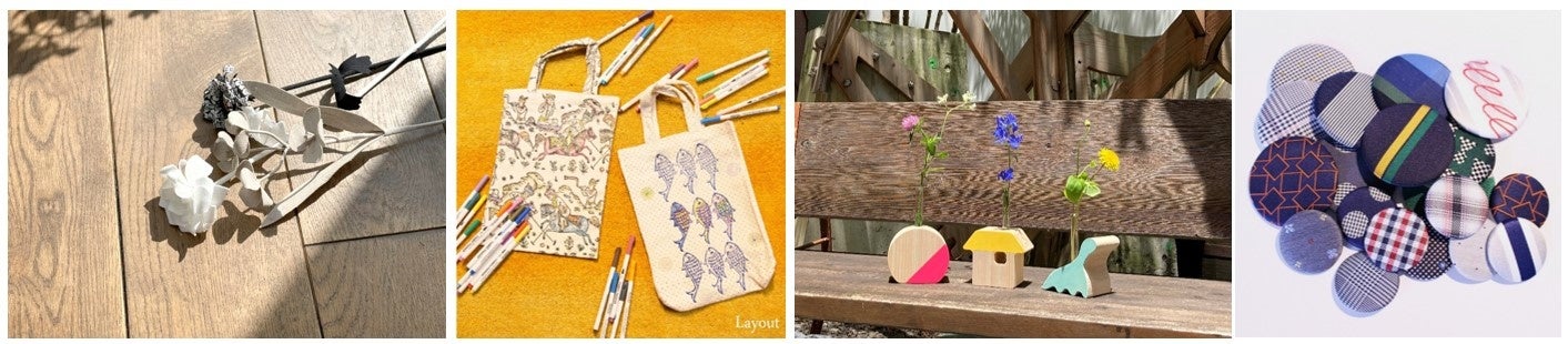 「 UpcycleLino™ × Lovéco」による 洋服の裁断くずからお花をつくるワークショップや「giraffe」によるネクタイ生地を使った缶バッチづくり、「コクヨ」による間伐材を使ったフラワーベースづくりなど、お子様から大人まで楽しめるワークショップが目白押し。