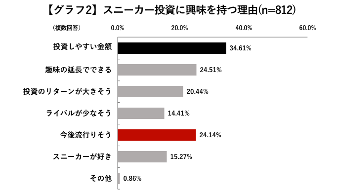 次に、「スニーカー投資に興味がある」と答えた方812名を対象に、その理由を尋ねました。「スニーカー投資のどんなところに興味がありますか。」との問いに対する答えは、「投資しやすい金額」(34.61%)が1位、「趣味の延長でできる」(24.51%)が2位となり、「エントリーのしやすさ」が大きな魅力と言えそうです。「今後流行りそう」(24.14%)、「ライバルが少なそう」(14.41%)と「トレンド性」または「将来性」に注目する投資経験者が多いことも特長的です。【グラフ2】