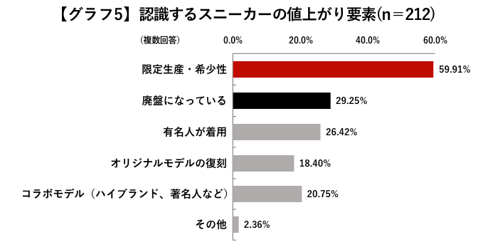 「廃盤モデル」「コラボ」なども重要視される。投資の重要なポイントとなる「値上がり要素」についてはどう認識されているのでしょうか。アンケートでは「限定生産・希少性」(59.91%)が1位で、もっとも重要視されている指標と言えます。それに加えて、「廃盤」(29.25%}「有名人着用」(26.42%)「復刻モデル」(18.40%)「コラボモデル」(20.75%)などの要素を備えたスニーカーが値上がりしやすく、投資価値があると言えそうです。【グラフ5】