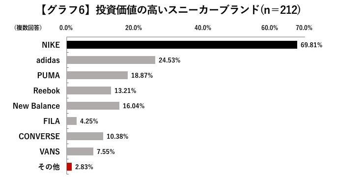 投資価値の高いスニーカーをブランドごとに調査しました。「スニーカー投資で利益を上げたことのあるブランドはどこですか。」との問いに対しては、「NIKE(ナイキ)」(69.81%)が他ブランドを大きく引き離しました。高級時計投資で「ROLEX」にあたる鉄板のブランドが「NIKE」であると言えるでしょう。「その他」(2.83%)では自由回答として「Luis Vuitton」「オニツカタイガー」といったブランドが寄せられました。ほか、スニーカーの別注モデルで著名なショップ「atmos」をあげる方も。【グラフ6】