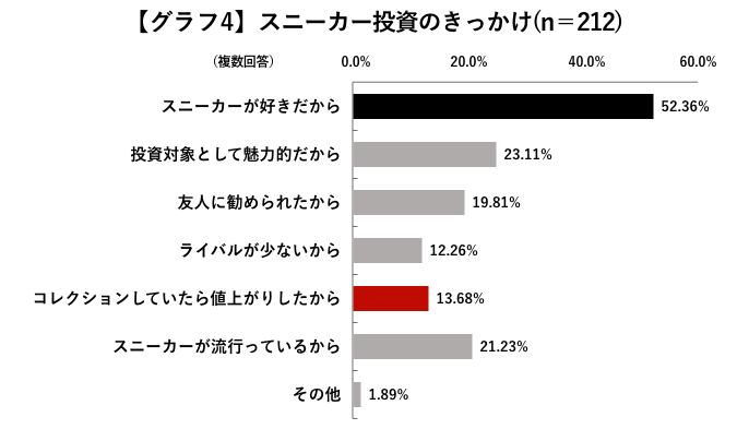 スニーカー投資をはじめたきっかけは「スニーカーが好きだから」が約5割と圧倒的。
