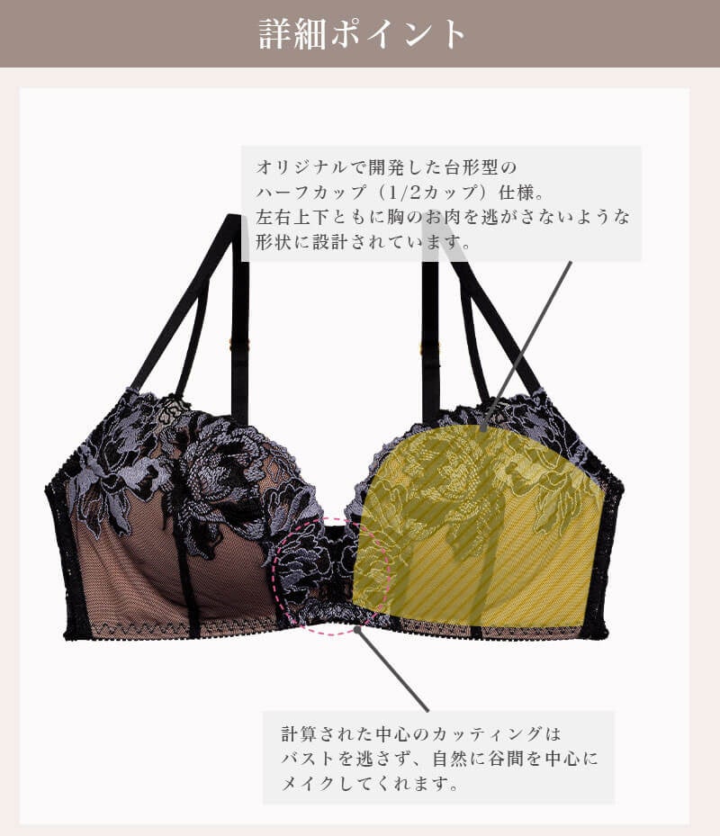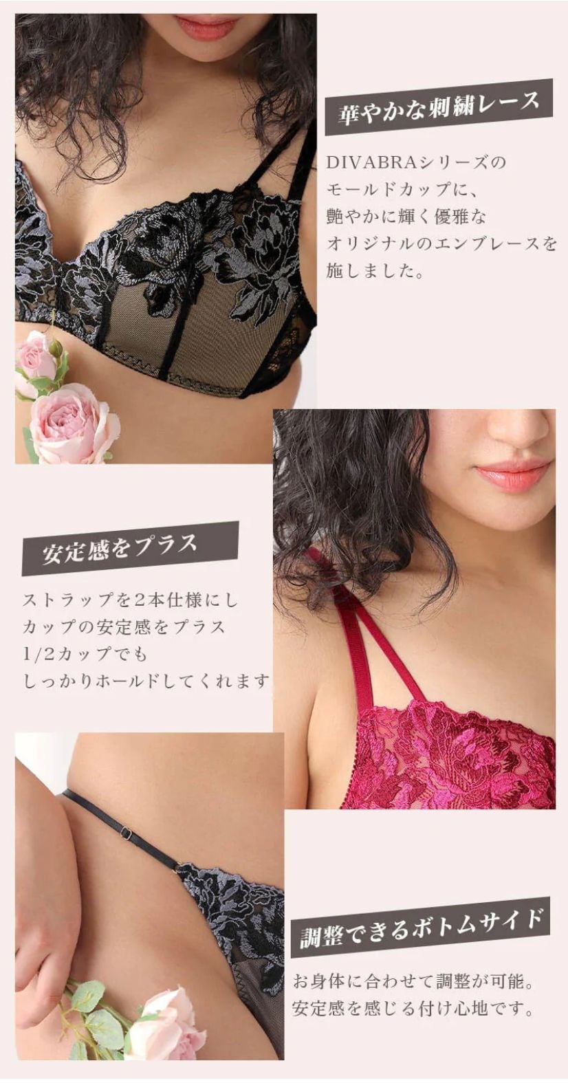 独自開発した特殊技術のDIVABRA seriesに、艶やかに輝く優美なオリジナルエンブレースを施したランジェリー。 透け感のあるチュールに、立体的な大花のエンブレースは存在感のあるデザインです。