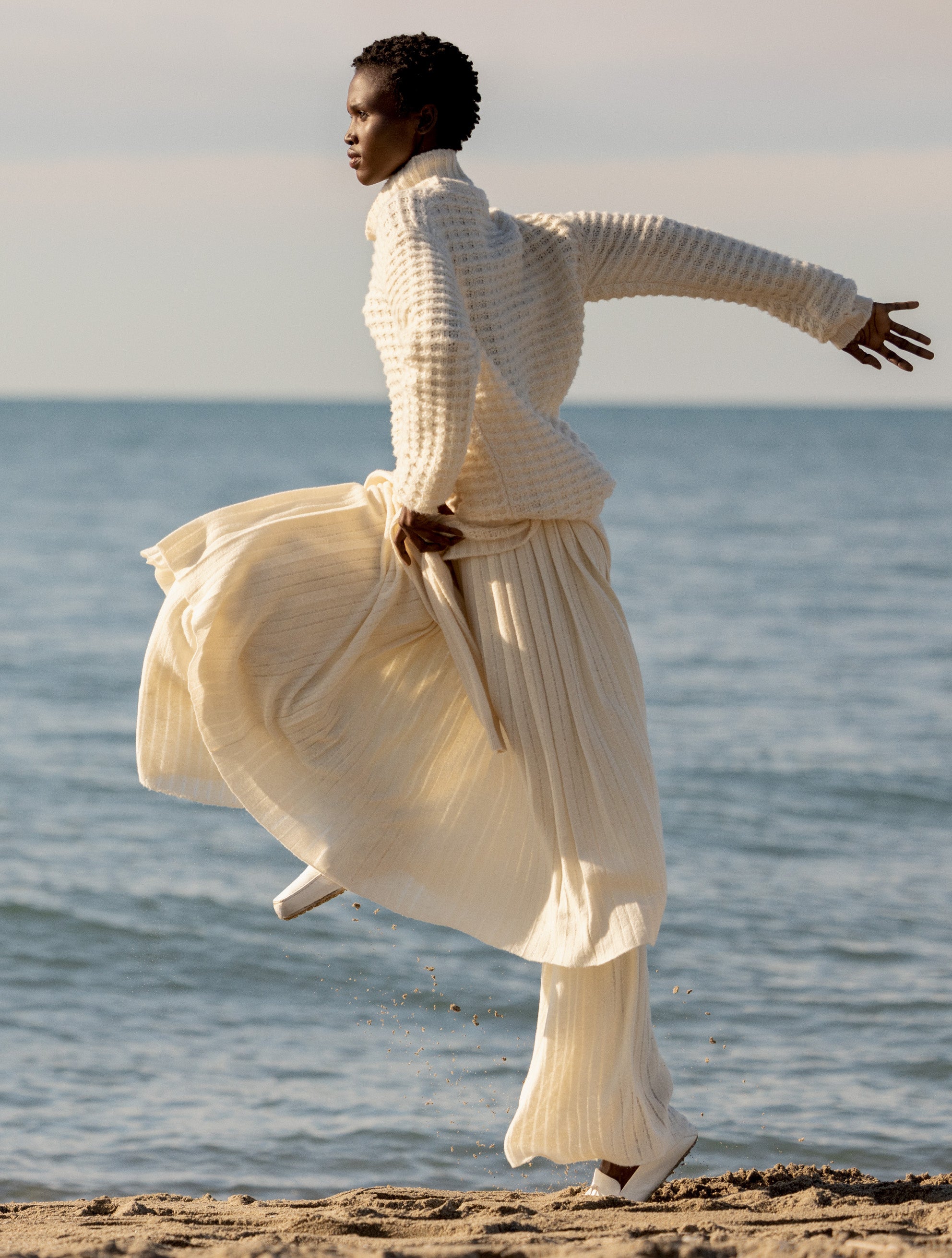 写真では、フォルムの流れ、質感の密度、コレクションの色彩の安心感が写し出されています。それはイタリアの旅そのものであり、アクティブさとアウトドア、気だるさと穏やかなフォーマルのバランスが取れています。完璧なテーラードスーツとエアリーなドレスは、ブークレのコート、ニットジャンパー、ロロ・ピアーナのアイコンと融合し、コットン、カシミヤ、シルク、リネンが自然な色合いのアースカラーにミックスされています。