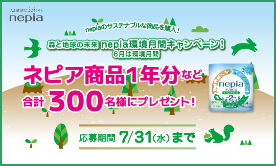 「ネピeco」商品一年分など環境にやさしい賞品が合計300名に当たる!「森と地球の未来 nepia環境月間キャンペーン」