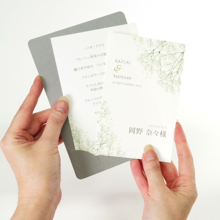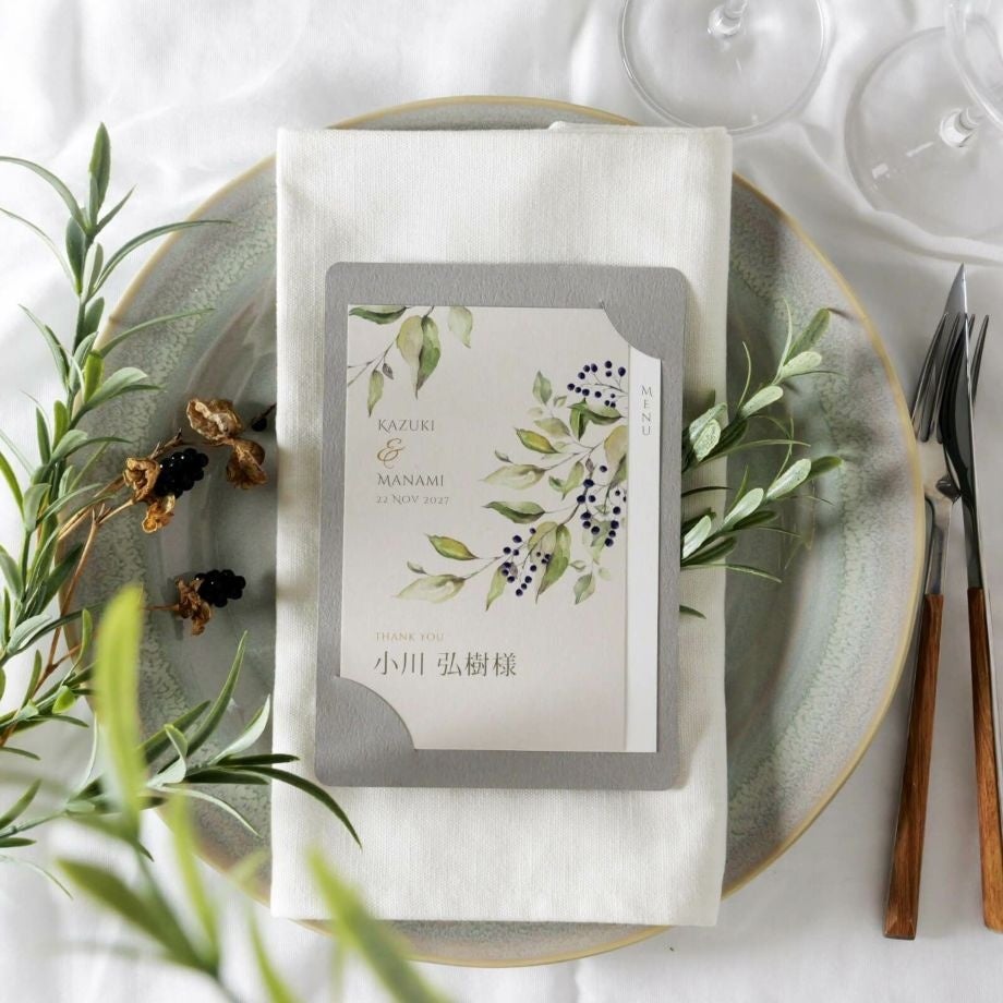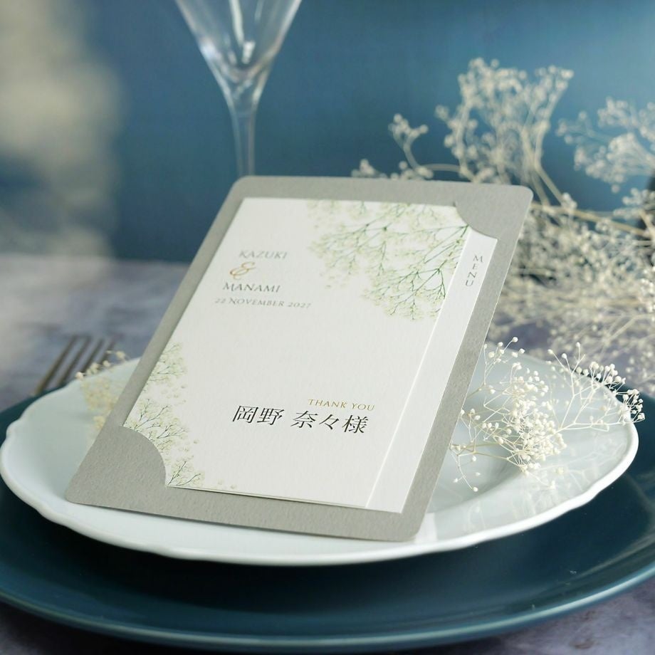 また、ベースとなる紙もシックなグレー・ナチュラルなベージュと2色あるため、ナプキンや装花との組み合わせも楽しめる。デザイン性を損なわず実用性も高い仕様になっています。