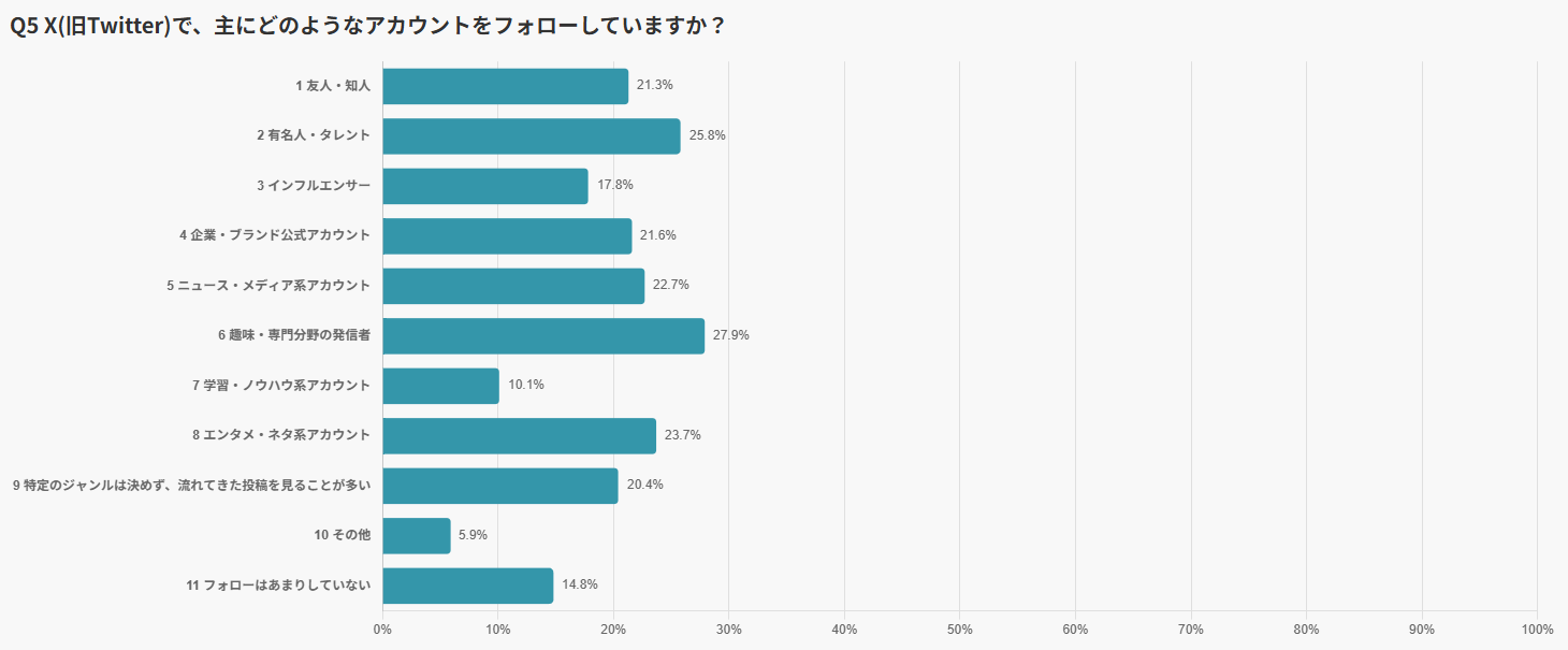 また「趣味・専門分野の発信者」を28.38%(124人)がフォローしており、特定のジャンルにおける深い知見を求めて、質の高い個人アカウントを厳選している様子がうかがえます。