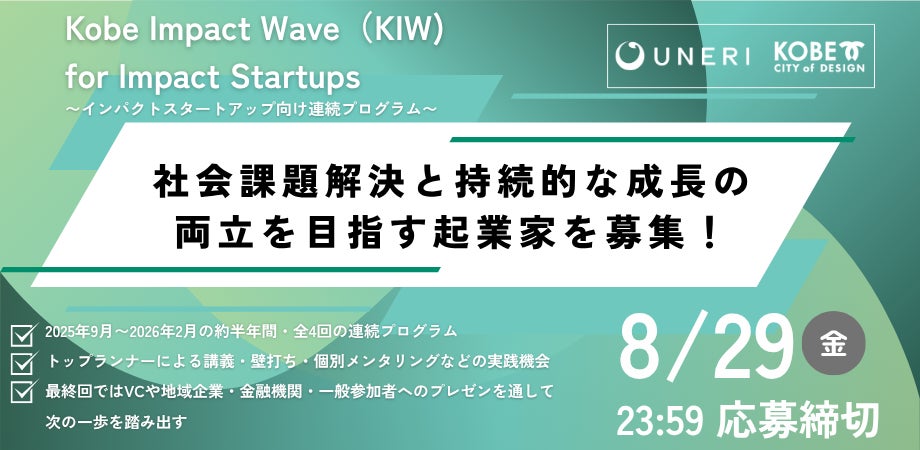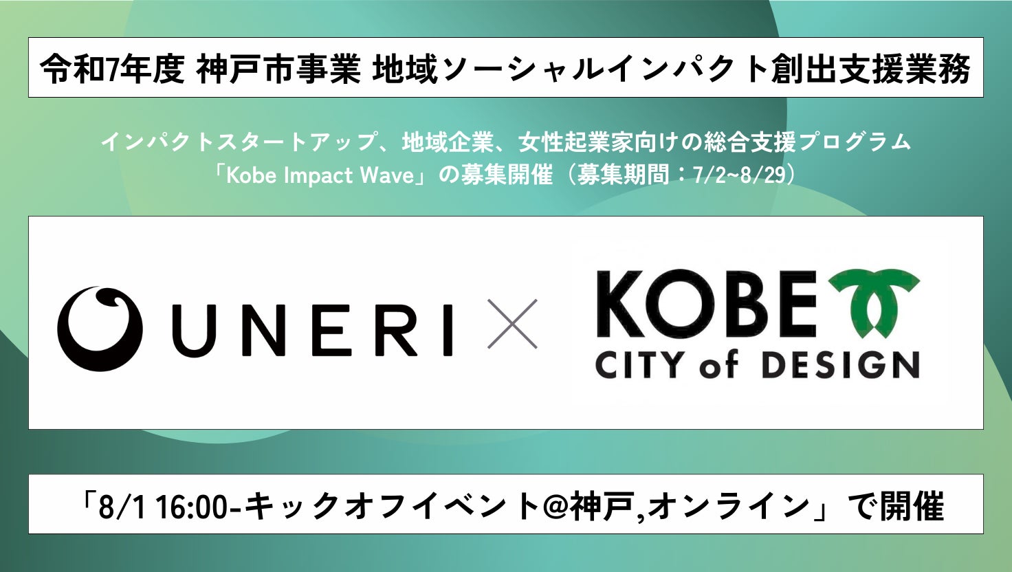 社会課題解決型スタートアップの育成・投資・企業/行政連携事業を展開する株式会社UNERI(本社:愛知県名古屋市 代表取締役CEO:河合将樹)は、神戸市が運営する「神戸市内における社会課題の解決およびソーシャルインパクトの創出・拡大」を目的とした総合プログラム「Kobe Impact Wave(以下KIWと表記。) 」の運営事務局を務めます。