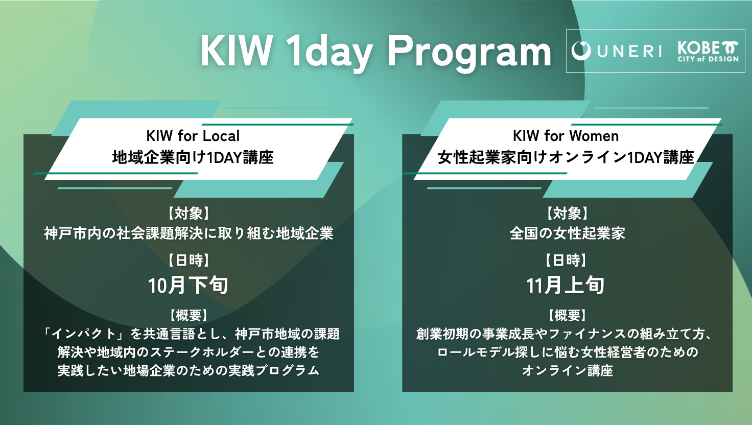 KIWは、下記2つの講座と1つの連続プログラムを含めた合計3コース(インパクトスタートアップ、女性起業家、地域企業)で実施し、神戸市内外の幅広いステークホルダー同士が、「インパクト(非財務的な価値)」を共通言語に社会課題解決を意図した新しい連携促進やエコシステム形成を目指します。